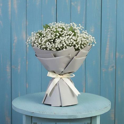 Современный букет из белой гипсофилы в дизайнерской упаковке. Яркая, небесного цвета упаковка подчеркивает красоту белоснежных цветов! Такой букет привлечет внимание всех окружающих. Подарить букет белых гипсофил — значит подчеркнуть в девушке чистоту ее души и показать ваши искренние намерения.