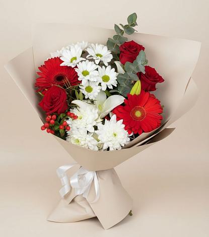 Что может больше напомнить о лете и согреть даже в самый непогожий день? Конечно такой яркий и лучистый букет с ароматной лилией! А в сочетании с красной розой, герберой и хризантемой, получится идеальная композиция. Таким сюрпризом вы можете просто порадовать близкого Вам человека и подарить ему кусочек лета, или преподнести букет по случаю праздника.